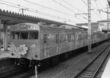 Keywords: Sakura Train 19880409.jpg A JR East Yokohama Line 103 series EMU at Higashi-Kanagawa Station decorated as a Sakura Train to mark the first anniversary of the establishment of JR East ja JR 日 発足1周年を う の装飾列車 1988-04-09 own Hahifuheho cc-zero Uploaded with UploadWizard 1988 in rail transport in Japan Black and white photographs of Japan in the 1980s Black and white photographs of trains in Japan JNR 103 JR East Higashi-Kanagawa Station