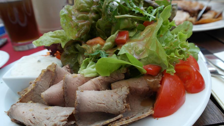 Keywords: salad leaf lettuce tomato roast beef meat healthy vitamins food eat meal red green tasty dressing vinegar oil