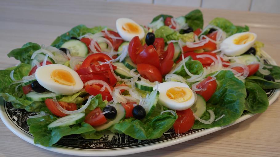 Keywords: salad salad plate leaf lettuce green cucumber paprika tomato food vegetables red frisch colorful healthy nutrition vitamins tasty eat egg yolk