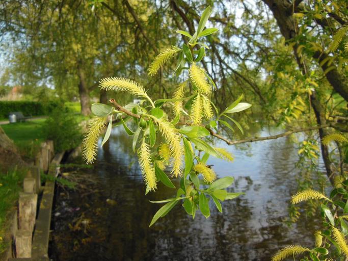 Keywords: salix old willow catkins close-up flowering trees nature willow moat green yellow brown water tree