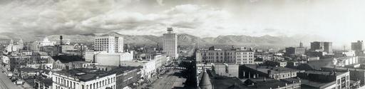 Keywords: Salt Lake City 1913 panorama.jpg 40 764917 -111 894346 region US-UT_heading E Panoramic photo of Salt Lake City downtown taken in 1913 The photo appears to have been taken from the intersection of 200 South and West Temple Streets looking east To the far left is the Salt Lake Temple The very white building right of the Temple is Hotel Utah about one year old at the time The skyscraper just north of 200 South Street near the center of the photograph is the Walker Center Tower Just visible on the right side of the photo is the Salt Lake City and County Building clocktower Image from the Library of Congress PAN US GEOG - Utah no 18 PD-old 1913 photographs Utah skylines Black and white panoramic photographs of cities Cityscapes of Salt Lake City Utah in the 1910s |
