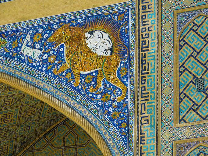 Keywords: samarkand registan square uzbekistan sher dor madrassah tiger lion mythical creatures mosaic sandy place space madrasahs minaret turquoise majolica ceramic tile