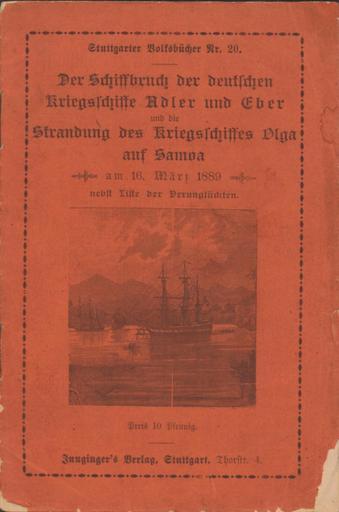 Keywords: Samoa.JPG de Der Schiffbruch der deutschen Kriegsschiffe Adler und Eber und die Strandung des Kriegsschiffes Olga auf Samoa am 16 März 1889 nebst Liste der Verunglückten Junginger's Verlag Stuttgart Thorstr 4 Stuttgarter Volkerbücher 20 16 Seiten Beschreibung des Unglücks 3 Seiten Liste der Opfer nach Name Rang und Herkunft of the accident 3 pages list of victims by name rank and origin Scan des Covers eines Buches im eigenen Besitz Volkerj 2011-12-30 Cc-zero SMS Eber ship 1887 Olga ship 1881 1889 works Adler ship 1883 History of Samoa Red cover books
