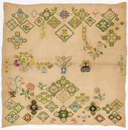 | Keywords: Sampler - Google Art Project (6851370).jpg 6938587 Unknown /collection/cooper-hewitt-national-design-museum/artwork/sampler-unknown/6851370/ 177108 author /collection/cooper-hewitt-national-design-museum/ Cooper-Hewitt National Design Museum 3644669 http //www cooperhewitt org/ /collection/cooper-hewitt-national-design-museum/artwork/sampler-unknown/6851370/ 1700 18th century Medium silk embroidery on linen foundationTechnique embroidered in rococo stitches on plain weave foundation 566 6851370 False 1799 1981-28-53 http //collection cooperhewitt org/view/objects/asitem/id/177108 Bequest of Gertrude M Oppenheimer Sampler 1700 1800 w570 x h566 cm 18th century False 0 98046875 Object sampler-unknown Sampler s 570 H x W 56 5 x 57 2 cm 22 1/4 x 22 1/2 in Medium silk embroidery on linen foundationTechnique embroidered in rococo stitches on plain weave foundation special url_id UwFOxxY6_mWleg PD-old-100-1923 Google Art Project works by unknown artist Textiles in the Cooper “Hewitt Smithsonian Design Museum 18th-century samplers Google Art Project works in Cooper-Hewitt Smithsonian Design Museum |