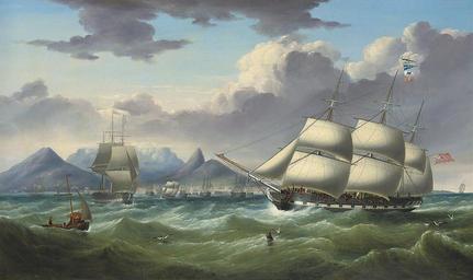| Keywords: Samuel Walters - merchantman Duke of Lancaster.jpg ca 1832 oil canvas cm 71 2 118 2 object history credit line signed 'Walters' lower right The full-rigged ship žDuke of Lancaster was built at Liverpool in 1820 and operated by one of that city's most prominent ship-owners Mr John Gladstone Measured at 565 tons she was quite a large vessel for her day and drew 19 feet of water when fully laden She was also stoutly built with iron knees and proved iron cables as well as having a copper-sheathed hull Under her first master Captain Morrison she was employed in the Calcutta trade and continued thus albeit with some later trips to Bombay under Captain Hargraves for the rest of her career until disappearing from record in 1844 <br/> žRoyal Saxon 510 tons and another Liverpool ship was built in the city in 1829 and owned by Kendall Co From the outset under her first master Captain Renner she traded to Batavia Java and continued on this route under her new master Captain Black after 1834 Around 1840 after she had been sold to owns of London she altered her regular run to Port Phillip Australia and thereafter Sydney before disappearing from record in 1844 <br/> Given that both the principal vessels portrayed here are unrecorded after 1844 - a remarkable coincidence - and Royal Saxon passed into the fleet of a London owner in 1840 it is almost certain that this work would have been painted during the 1830s <ref>http //www christies com/lotfinder/LotDetailsPrintable aspx intObjectID 5259448 christies com</ref> reflist accession number Christie's online 5259448 PD-old-100 Samuel Walters 19th-century sailing ships in paintings Duke of Lancaster ship 1820 Cape of Good Hope 1830s paintings |