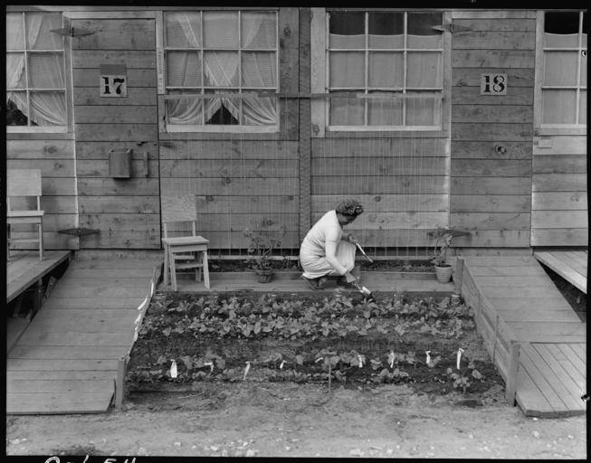 Keywords: San Bruno, California. Mrs. Fujita working in her tiny vegetable garden she has planted in front of . . . - NARA - 537952.jpg Scope and content The full caption for this photograph reads San Bruno California Mrs Fujita working in her tiny vegetable garden she has planted in front of her barrack home at this assembly center General notes 537952 Local identifier 210-G-C654 Department of the Interior War Relocation Authority 02/16/1944 - 06/30/1946 NARA-Author Lange Dorothea 1895-1965 Photographer 1372774 <br /> Still Picture Records Section Special Media Archives Services Division NWCS-S National Archives at College Park 8601 Adelphi Road College Park MD 20740-6001 1942-06-16 Record group Record Group 210 Records of the War Relocation Authority 1941 - 1989 Record group ARC 537 Central Photographic File of the War Relocation Authority compiled 1942 - 1945 Series ARC 536000 File unit File unit ARC Variant control numbers NAIL Control Number NWDNS-210-G-C654 Other versions <gallery> File San_Bruno _California _Mrs _Fujita_working_in_her_tiny_vegetable_garden_she_has_planted_in_front_of_ _ _ _-_NARA_-_537952 tif tif File San_Bruno _California _Mrs _Fujita_working_in_her_tiny_vegetable_garden_she_has_planted_in_front_of_ _ _ _-_NARA_-_537952 jpg jpg </gallery> NARA-cooperation PD-USGov Dorothea Lange Tanforan Assembly Center |