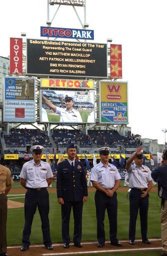 | Keywords: SAN DIEGO PADRES MILITARY OPENING DAY DVIDS1077485.jpg en SAN DIEGO April 21 2005 San Diego area military men and women were recognized during the San Diego Padres Military Opening Night at Petco Park YN2 Matthew MacKillop AET1 Patrick Moellenberndt BM2 Ryan Rinowski and AMT2 Rich Salerno represented the U S Coast Guard USCG photo by PA1 Robert K Lanier 2005-04-21 https //www dvidshub net/image/1077485 1077485 2013-12-11 17 42 SAN DIEGO CA US PD-USGov San Diego Padres Images from DoD uploaded by Fæ |