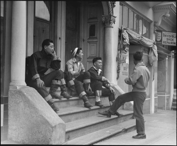 | Keywords: San Francisco, California (Buchanan Street). High School boys of Japanese ancestry in the Japanese . . . - NARA - 537604.jpg Scope and content The full caption for this photograph reads San Francisco California Buchanan Street High School boys of Japanese ancestry in the Japanese quarter on a busy Saturday afternoon watching preparations for evacuation which is due in a few days General notes 537604 Local identifier 210-G-C257 Department of the Interior War Relocation Authority 02/16/1944 - 06/30/1946 NARA-Author Lange Dorothea 1895-1965 Photographer 1372774 <br /> Still Picture Records Section Special Media Archives Services Division NWCS-S National Archives at College Park 8601 Adelphi Road College Park MD 20740-6001 1942-04-04 Record group Record Group 210 Records of the War Relocation Authority 1941 - 1989 Record group ARC 537 Central Photographic File of the War Relocation Authority compiled 1942 - 1945 Series ARC 536000 File unit File unit ARC Variant control numbers NAIL Control Number NWDNS-210-G-C257 Other versions <gallery> File San_Francisco _California_ Buchanan_Street _High_School_boys_of_Japanese_ancestry_in_the_Japanese_ _ _ _-_NARA_-_537604 tif tif File San_Francisco _California_ Buchanan_Street _High_School_boys_of_Japanese_ancestry_in_the_Japanese_ _ _ _-_NARA_-_537604 jpg jpg </gallery> NARA-cooperation PD-USGov Japantown San Francisco in 1942 Dorothea Lange |