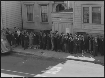 | Keywords: San Francisco, California. Heads of families and single persons living alone, of Japanese ancestry, . . . - NARA - 537526.jpg Scope and content The full caption for this photograph reads San Francisco California Heads of families and single persons living alone of Japanese ancestry in response to Civilian Exclusion Order Number 20 line up on Bush Street for half a block at the Wartime Civil Control Administration Control Station to receive their final instructions concerning their evacuation The evacuation of this district will be completed in five days from the time this photograph was made Note Exclusion Order posted on garage door; also House for Sale sign These evacuees and others of Japanese descent will spend the duration at War Relocation Authority centers General notes 537526 Local identifier 210-G-C176 Department of the Interior War Relocation Authority 02/16/1944 - 06/30/1946 NARA-Author Lange Dorothea 1895-1965 Photographer 1372774 <br /> Still Picture Records Section Special Media Archives Services Division NWCS-S National Archives at College Park 8601 Adelphi Road College Park MD 20740-6001 1942-04-25 Record group Record Group 210 Records of the War Relocation Authority 1941 - 1989 Record group ARC 537 Central Photographic File of the War Relocation Authority compiled 1942 - 1945 Series ARC 536000 File unit File unit ARC Variant control numbers NAIL Control Number NWDNS-210-G-C176 Other versions <gallery> File San_Francisco _California _Heads_of_families_and_single_persons_living_alone _of_Japanese_ancestry _ _ _ _-_NARA_-_537526 tif tif File San_Francisco _California _Heads_of_families_and_single_persons_living_alone _of_Japanese_ancestry _ _ _ _-_NARA_-_537526 jpg jpg </gallery> NARA-cooperation PD-USGov Dorothea Lange Japanese American internment processing in San Francisco |