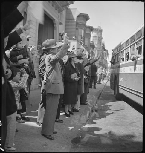 | Keywords: San Francisco, California. Inhabitants of the Japanese section wave farwell at the departure of the . . . - NARA - 537740.jpg Scope and content The full caption for this photograph reads San Francisco California Inhabitants of the Japanese section wave farwell at the departure of their friends and neighbors whom they are soon to follow to Tanforan Assembly center This bus contains some of the 660 persons to be evacuated on this day In three more days these streets will be deserted of persons of Japanese ancestry General notes 537740 Local identifier 210-G-C416 Department of the Interior War Relocation Authority 02/16/1944 - 06/30/1946 NARA-Author Lange Dorothea 1895-1965 Photographer 1372774 <br /> Still Picture Records Section Special Media Archives Services Division NWCS-S National Archives at College Park 8601 Adelphi Road College Park MD 20740-6001 1942-04-19 Record group Record Group 210 Records of the War Relocation Authority 1941 - 1989 Record group ARC 537 Central Photographic File of the War Relocation Authority compiled 1942 - 1945 Series ARC 536000 File unit File unit ARC Variant control numbers NAIL Control Number NWDNS-210-G-C416 Other versions <gallery> File San_Francisco _California _Inhabitants_of_the_Japanese_section_wave_farwell_at_the_departure_of_the_ _ _ _-_NARA_-_537740 tif tif File San_Francisco _California _Inhabitants_of_the_Japanese_section_wave_farwell_at_the_departure_of_the_ _ _ _-_NARA_-_537740 jpg jpg </gallery> NARA-cooperation PD-USGov Dorothea Lange Japanese American internment processing in San Francisco |