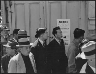 | Keywords: San Francisco, California. In response to the Army's Exclusion Order Number 20, residents of Japane . . . - NARA - 536406.jpg Scope and content The full caption for this photograph reads San Francisco California In response to the Army's Exclusion Order Number 20 residents of Japanese ancestry appear at Civil Control Station at 2031 Bush Street for registration The evacuees will be housed in War Relocation Authority centers for the duration General notes 536406 Local identifier 210-G-A514 Department of the Interior War Relocation Authority 02/16/1944 - 06/30/1946 NARA-Author Lange Dorothea 1895-1965 Photographer 1372774 <br /> Still Picture Records Section Special Media Archives Services Division NWCS-S National Archives at College Park 8601 Adelphi Road College Park MD 20740-6001 1942-04-23 Record group Record Group 210 Records of the War Relocation Authority 1941 - 1989 Record group ARC 537 Central Photographic File of the War Relocation Authority compiled 1942 - 1945 Series ARC 536000 File unit File unit ARC Variant control numbers NAIL Control Number NWDNS-210-G-A514 Other versions <gallery> File San_Francisco _California _In_response_to_the_Army's_Exclusion_Order_Number_20 _residents_of_Japane_ _ _ _-_NARA_-_536406 tif tif File San_Francisco _California _In_response_to_the_Army's_Exclusion_Order_Number_20 _residents_of_Japane_ _ _ _-_NARA_-_536406 jpg jpg </gallery> NARA-cooperation PD-USGov Dorothea Lange Japanese American internment processing in San Francisco |