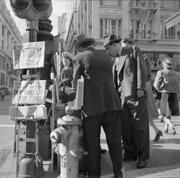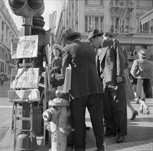| Keywords: San Francisco Newspapers After Pearl Harbor Attack.jpg  Corner of Montgomery and Market Streets Monday morning December 8 1941 after Japanese attack on Pearl Harbor San Francisco California Shows people looking at newspaper headlines Photo by John Collier via Library of Congress website http //www loc gov/pictures/item/fsa2000052846/PP/; high res TIF converted to jpg border cropped and contrast adjusted before uploading to Wikimedia Commons 1941-12-08 John Collier PD-USGov 1941 in San Francisco December 1941 in the United States Pearl Harbor attack Fashion in 1941 1941 newspapers Newspapers of San Francisco Fire hydrants in California 1941 photographs |
