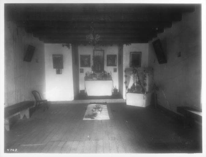 Keywords: San Mateo, private chapel of Don Manuel Chavez, Laguna, New Mexico, ca.1900 (CHS-4742).jpg en <br> San Mateo private chapel of Don Manuel Chavez Laguna New Mexico ca 1900 Photograph of San Mateo private chapel of Don Manuel Chavez Laguna New Mexico ca 1900 The chapel has a small altar at center at one end of the room with another smaller altar at right On the altar at center are many candlesticks and a crucifix The altar on the right has an overhanging veil with flowers decorating the perimeter of it Several framed pictures hang from the walls On the wooden floor lies a piece of white cloth with a flower arrangement on top of it A chair and two benches stand against the walls Call number CHS-4742 Photographer James George Wharton Filename CHS-4742 Coverage date circa 1900 Part of collection California Historical Society Collection 1860-1960 Type images Geographic subject city or populated place Laguna Repository name USC Libraries Special Collections Accession number 4742 Microfiche number 1-179- Archival file chs_Volume98/CHS-4742 tiff Part of subcollection Title Insurance and Trust and C C Pierce Photography Collection 1860-1960 Repository address Doheny Memorial Library Los Angeles CA 90089-0189 Geographic subject country USA Format aacr2 3 photographs transparency photoprints b w ; 20 x 25 cm 21 x 26 cm Rights Digitally reproduced by the USC Digital Library; From the California Historical Society Collection at the University of Southern California Subject adlf religious facilities Project USC Repository email specol usc edu Identifying number unidentified no James-1451 Contributing entity California Historical Society Date created circa 1900 Publisher of the digital version University of Southern California Libraries Format aat transparencies; photographic prints; photographs Geographic subject state New Mexico Legacy record ID chs-m17052; USC-1-1-1-13971 Access conditions Send requests to address or e-mail given Phone 213 821-2366; fax 213 740-2343 Subject file heading Indians -- Pueblo -- Pueblo villages New Mexico; Indians -- Pueblo -- New Mexico Subject lcsh Indians of North America circa 1900 date created George Wharton James 1858 1923 http //digitallibrary usc edu/cdm/ref/collection/p15799coll65/id/17065 PD-old-70-1923 Images from USC Digital Library uploaded by Fæ Photographs by George Wharton James California Historical Society Collection 1860-1960 Laguna New Mexico