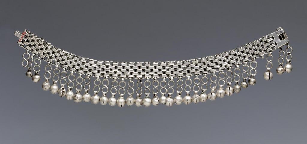 | Keywords: Sana - Necklace - Walters 572315 - Back.jpg The close-fitting necklace consists of a broad chain which combines square plaques with four-ball décor and originally green enamel and those with a flat gilded surface The basic motif of series has three vertical arranged plaques with and two without décor The ornament on the rectangular clasp combines a central rosette with double-volutes in the corners The necklace has thirty-three loops with thirty-two preserved pendants with ball-shaped dangles On the back of the clasp is an Arabic stamp with the name of the ruler al-Mansur Al-Mansur Ali I ruled from AH 1189 to 1224 AD 1775-1809 In addition there is the name of the silversmith engraved in Hebrew xxx Sana ani The first name of the silversmith is lost but it is mentioned that he and his family come from Sana a' 1189-1224 AH/AD 1775-1809 silver with gilding green enamel L 10 9/16 x W 5/8 in 26 9 x 1 6 cm accession number 57 2315 80919 Mr Benjamin Zucker Zucker Family Trust and Mr Derek Content New York and London by purchase Walters Art Museum Joint gift to the Walters Art Museum Baltimore and the Israel Museum Jerusalem by Mr Benjamin Zucker and Mr Derek Content in honor of Mrs Barbara Zucker and Mrs Amanda Content 2010 Stamp In Arabic al-Mansur; Engraved In Hebrew xxx San'ani place of origin Sana'a Yemen Walters Art Museum license Jewellery in the Walters Art Museum South Arabian art in the Walters Art Museum Sana'ani Media contributed by the Walters Art Museum needs category review |