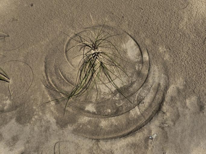 Keywords: sand beach blade of grass wind image circles in the sand drawn sand beach traces excerpt of the beach dunes art artfully artistically natural artwork texture ornament background form structure