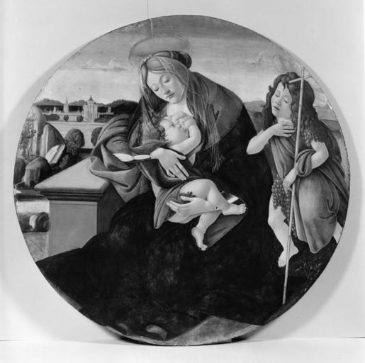 | Keywords: Sandro Botticelli - Madonna and Child with the Young Saint John the Baptist - Walters 37422 (2).jpg This tondo round painting depicts the Virgo lactans which is the Latin term for the nursing Virgin Mary The image testifies to the humanity of Christ as it shows that he consumed food like all other humans Mary is seated on the ground In this pose she is known as the Madonna of Humility The young Saint John the Baptist Jesus' second cousin gazes reverently at Christ John the Baptist was the patron saint of Florence and the painting comes from the Florentine artist Sandro Botticelli's workshop as can be seen in its graceful contours so it was most likely painted for a patron from that city A tondo was not used as an altarpiece and could be hung in a private home For more information on this tondo please see Zeri catalogue number 58 p 94 between 1495 1499 Renaissance tempera and oil on wood panel Painted surface Diam 36 13/16 x D 1 7/16 in 93 5 x 3 7 cm accession number 37 422 15551 Don Marcello Massarenti Collection Rome date and mode of acquisition unknown 1897 catalogue no 31 as Botticelli Henry Walters city Baltimore Walters Art Museum Henry Walters Acquired by Henry Walters with the Massarenti Collection 1902 place of origin Florence Italy <gallery> File Sandro Botticelli - Madonna and Child with the Young Saint John the Baptist - Walters 37422 jpg </gallery> Walters Art Museum license 2D Italian Renaissance paintings in the Walters Art Museum Paintings in the Walters Art Museum Paintings of John the Baptist Media contributed by the Walters Art Museum needs artist update Madonna and Child with Saint John Botticelli |