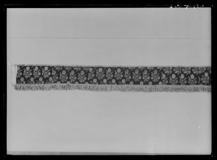 | Keywords: Sängomhänge, Torpa stenhus - Livrustkammaren - 27620.tif LSH artwork sv Del av sängomhänge till stolpsäng Sängomhänget består av fyra våder De två yttre och en av mittvåderna är i benvitt siden med invävt mönster i form av stiliserade blommor i geometriska former Den andra mittvåden är av svart sidenatlas med invävda blomsterkvistar i gul cerise vit och grön silke Överst är den svarta våden lappad med en remsa i samma tyg Vit vådbredd ytterst 465 mm i mitten 225 mm Svart vådbredd 500 mm <br/>Franskant runt om långsidorna och nedre kortsidan av svart beige och vit silke bredd 18 mm <br/>Längs överkanten elva metallringar av vilka nio är av gul grövre metall med raka kanter Två är av vit metall Fästa med beigefärgat garn eller beige/svarta sidenband original caption silk Färg benvit vit d1 - dräkt - yttermaterial material siden - silk Färg svart gul cerise vit grön d1 - dräkt - yttermaterial material sidenatlas - silk Färg svart beige vit d4 - dräkt - passpoaler band kantning uppslag material silkesfrans - metal Färg gul vit d5 - dräkt - knappar och spännen material metall - yarn Färg beige d5 - dräkt - knappar och spännen material garn - silk Färg beige svart d5 - dräkt - knappar och spännen material sidenband g 560 size mm 1720 1690 LRK Himmelssängar place of origin original filename LN_B16493_019373 56192 inventory number LRK 19612 27620 CC0 Sängomhänge Torpa stenhus - Livrustkammaren - 27620-negative tif <gallery caption Different images of same object > File Sängomhänge Torpa stenhus - Livrustkammaren - 44739 tif File Sängomhänge Torpa stenhus - Livrustkammaren - 10496 tif File Sängomhänge Torpa stenhus - Livrustkammaren - 61861 tif File Sängomhänge Torpa stenhus - Livrustkammaren - 36181 tif File Sängomhänge Torpa stenhus - Livrustkammaren - 53300 tif File Sängomhänge Torpa stenhus - Livrustkammaren - 19058 tif File Sängomhänge Torpa stenhus - Livrustkammaren - 70423 tif File Sängomhänge Torpa stenhus - Livrustkammaren - 78982 tif </gallery> Media contributed by LSH without any categories Media contributed by LSH unmatched objKeyword Media contributed by LSH 2014-11 |