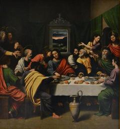 | Keywords: Sant Sopar de Joan de Joanes, Museu de Belles Arts de València.JPG La obra muestra a Jesucristo y a sus doce apóstoles cenando en la víspera de la pasión y muerte del Salvador ca Sant Sopar de Joan de Joanes oli sobre taula Museu de Belles Arts de València Joan de Joanes va pintar des de molt jove en col·laboració amb son pare i aquesta és la primera obra de la qual consta que és un treball exclusivament seu Va pertànyer al retaule que els argenters de València van dedicar al seu patró sant Eloi a la parròquia de santa Caterina El pintor tradueix en imatges el moment en què Crist anuncia als seus deixebles que un d'ells el trairà mereix especial atenció el tractament naturalista dels elements del bodegó Siglo XVI oil on panel Size cm 84 92 Institution Museo de Bellas Artes de Valencia http //museobellasartesvalencia gva es/index php option com_content view article id 603 3Asanta-cena catid 54 3Arenacimiento-pleno Itemid 80 lang es object history exhibition history credit line accession number 305 own PD-old-100 cc-by-sa-3 0 Santa Cena de Joan de Joanes Museu de Belles Arts de València |