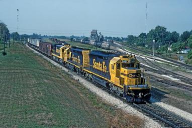 | Keywords: santa fe santafe at&sf atsf railroad outdoor vehicle train locomotive ATSF 5051, 3807, and 8738 and train and caboose rolling through Marceline, MO one morning in August 1983. ATSF 5051, 3807, and 8738 and train and caboose rolling through Marceline, MO one morning in August 1983. |