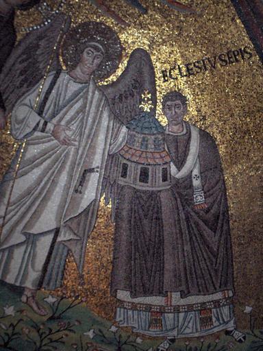 Keywords: SanVitale16.jpg Cupola of the choir an angel offers a model of the church to bishop Ecclesius; Basilica of San Vitale in Ravenna Italy Abside della basilica di San Vitale a Ravenna decorata con mosaici bizantini compiuti entro il 547 Un angelo offre un modello di chiesa al vescovo Ecclesio own 2006-04-05 Georges Jansoone PD-Art GFDL Cc-by-sa-3 0-migrated Cc-by-2 5 San Vitale Ravenna - Mosaics - Apse Mosaics of angels Ravenna Ecclesius bishop |