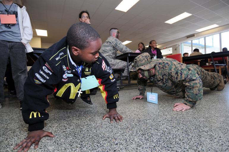 Keywords: Saturday Scholars DVIDS155605.jpg en A West Pensacola Elementary School Saturday Scholar student who says he wants to become a Marine does push-ups with Saturday Scholar mentor Pfc Kayla McCracken from Longview Texas during the final weekend of mentoring for the 48th session of Saturday Scholars hosted by Center for Information Dominance Corry Station 2009-02-21 Gary Nichols https //www dvidshub net/image/155605 090221-N-+++++-119 2009-03-08 05 45 PENSACOLA FL US PD-USGov-Military-Navy Push-ups Images from DoD uploaded by Fæ |