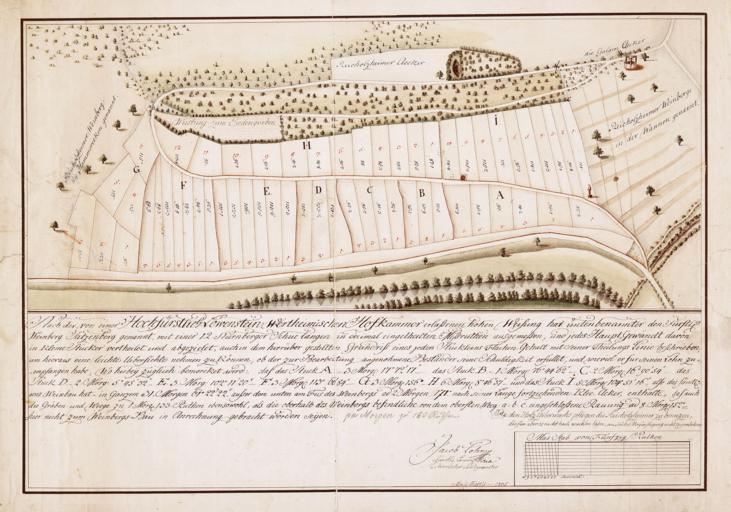 | Keywords: Satzenberg survey map 1805.png en Cadastral survey map of the Satzenberg vineyards along the Tauber River near Wertheim The vineyards still in operation are considered among the oldest in Germany dating back quite possibly to the 8th century Map dated March 1805 <br> For fiscal purposes the prince of Löwenstein-Wertheim-Rosenberg commissioned land surveyor Jakob Lohr to carry out a survey of the Satzenberg The vineyards had belonged to Bronnbach Abbey for centuries until the German Mediatization of 1802-1803 when the abbey was secularized and its property given to Löwenstein-Wertheim-Rosenberg The gallows 'Galgen at the crossroad top right corner indicate that Bronnbach Abbey exercised high jurisdiction Hochgerichtsbarkeit over the area 1805 http //www reicholzheim de/index php option com_content view article id 126 einer-der-aeltesten-weinberge-deutschlands catid 36 weinbau Itemid 81 Jakob Lohr 1805 other versions PD-old-100 Uploaded with UploadWizard Bronnbach Abbey Löwenstein-Wertheim family |