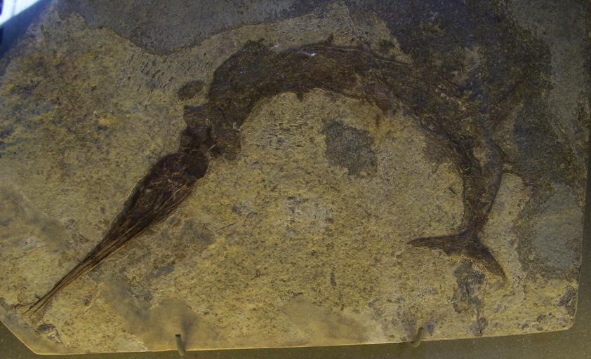 Keywords: Saurichthys curionii.jpg en Fossil of the ray-finned fish Saurichthys curionii from the Ladinian Middle Triassic Cassina beds Meride Limestone Formation of the Monte San Giorgio Ticino Switzerland Collection of the museum of natural history Museo cantonale di storia naturale http //www ti ch/dt/da/museo/temi/ of Lugano Stone slab is about 40 cm in width own Woudloper Saurichthys Triassic fossils Monte San Giorgio Palaeonisciformes fossils Museo Cantonale di storia naturale di Lugano January 2006 in Switzerland |