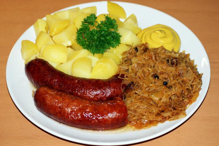 Keywords: sausage sauerkraut potatoes salt potatoes mustard parsley eat smoked cook food
