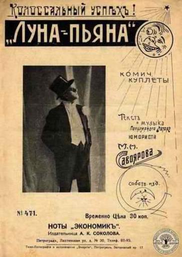| Keywords: Savoiarov M.N. Luna.jpg en Le Roi de Excentrique - russian poet composer chansonie Mikhail Savoiarov ru Ко оль эксцент ики - поэт композито певец и мим ихаил Савоя овъ - обложка нот его самой знаменитой песенки 1915 года кото ую аспевал весь Пет ог ад archives de --FinitoR Originally uploaded in ruwiki by ru Участник Финито as ru Savoiarov_M N _Luna jpg unknown pre-revolutionary Polygraph ~ 1916 PD-old Compositions by Mikhail Savoiarov | ||||