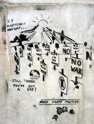 Keywords: Sblondon-elecgraffiti05.jpg Graffiti on the South Bank of the Thames in London Graffiti by http //www arofish org uk Arofish Photograph taken by Michael Reeve April 24 2005 Graffiti in London political graffiti Stencil graffiti in the United Kingdom |