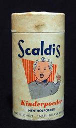 Keywords: Scaldis kinderpoeder busje, foto1.JPG Very old packaging of a Dutch product that is not produced and/or not sold any more own 2014-03-16 12 36 02 Alf van Beem CC-Zero Trademarked Talcum powder