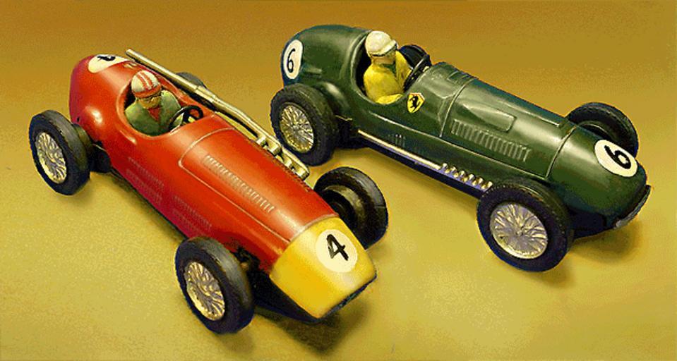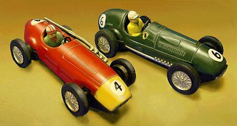 Keywords: Scalextric-Tin-Cars-restored.png en Very early Scalextric slot car models in 1 30 scale circa 1957 These pressed-steel-bodied racers were electric adaptations of Scalex clockwork-powered cars and are among the first commercially-offered slot cars of the modern era They represent the Maserati F250 left and the Ferrari 375 Grand Prix cars My own work based on downloaded photos see Additional Info below D Helber 2008-07-15 This image was created by me in Photoshop CS Version 8 It is a heavily modified combination of two separate photos from an auction site The original subjects of the photos were damaged and partially rusted examples I used them as a basis for a photo-restoration to show the models in original condition Modifications include corrections of dirt and discoloration rust spots dents missing and peeling paint; addition of missing parts; entirely new background; combination of two single image photos into one dual-image photo; perspective correction extensive modification of highlights to clarify form and for aesthetics This constitutes substantial modification of the original images in fact there is hardly an original pixel remaining on the bodies of the cars and as such constitutes a new work under US copyright law Scalextric Maserati model cars Ferrari F1 car model cars Maserati 250F |
