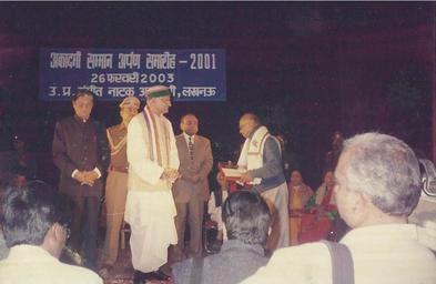 Keywords: Scan-mikii.jpg en Vijay Bose accepting Academy samman -2001 from the then Governer of UP Acharya Vishnu Kant Shastri jie own Basukamal 5 9 2001 Cc-zero 1927 births Theatre directors from India