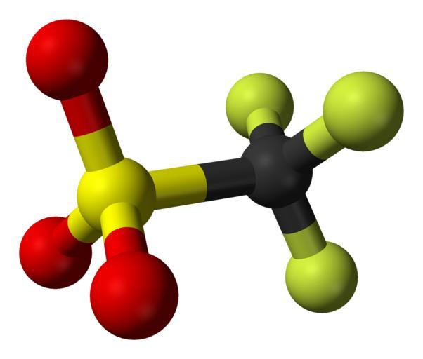 | Keywords: Scandium-triflate-hydrate-xtal-293K-triflate-anion-3D-balls.png Ball-and-stick model of the triflate trifluoromethanesulfonate anion TfO<sup> ˆ’</sup> i e F<sub>3</sub>CSO<sub>3</sub><sup> ˆ’</sup> in the crystal structure of hydrated scandium III triflate Sc H<sub>2</sub>O <sub>~8 0</sub> OTf <sub>3</sub> X-ray crystallographic data from http //dx doi org/10 1002/chem 200401339 Chem Eur J 2005 11 4065-4077 Model constructed in http //www crystalmaker com/ CrystalMaker 8 1 Image generated in http //accelrys com/products/discovery-studio/visualization/discovery-studio-visualizer html Accelrys DS Visualizer Own 2009-03-05 Ben Mills Benjah-bmm27 Images by Ben Mills Scandium III triflate Triflate ion |
