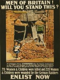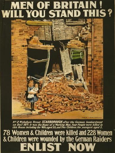 Keywords: Scarborough, North Yorkshire - WWI poster.jpg WWI recruitment poster referring to the German bombardment of Scarborough North Yorkshire England in 1915 Men of Britain Will you stand this 78 women children were killed and 228 women children were wounded by the German raiders Enlist now Caption No 2 Wykeham Street Scarborough after the German bombardment on Dec 16th It was the home of a working man Four people were killed in this house including the wife aged 58 and two children the youngest aged 5 LOC-image cph 3g11297 1915 Unknown Photo F Foxton Scarborough Publisher Parliamentary Recruiting Committee London The work was created before 1969 has an unknown author and was published before 30 August 1989 therefore its copyright expires 70 years after the first publication date making it public domain PD-1923 anonymous-EU Raid on Scarborough Hartlepool and Whitby World War I recruitment posters from the United Kingdom History of Scarborough North Yorkshire World War I anti-German propaganda Children in propaganda People and ruins in art Standing girls in art |