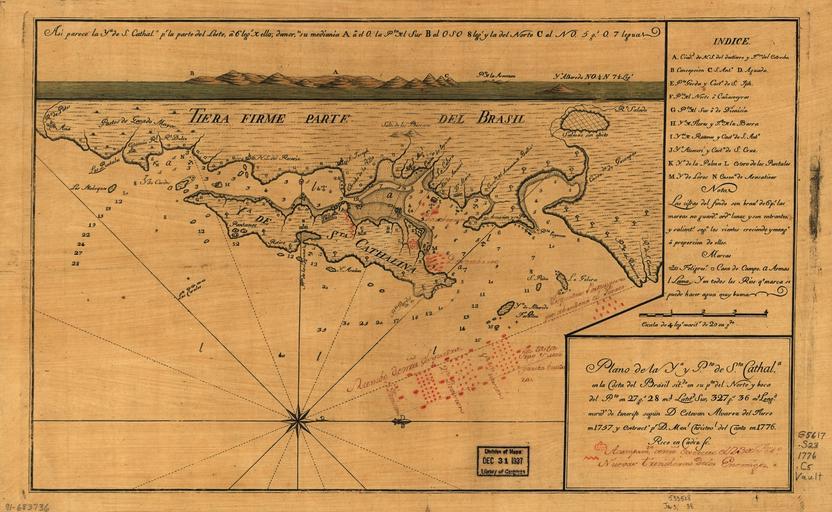Keywords: SCatarina Island map 1776.jpg Mapa da Ilha de Santa Cantarina e região próxima em espanhol publicado em 1776 ano em que a ilha foi invadida por tropas espanholas Local de desembarque das tropas é marcado com cor vermelha Santa Catarina Island published in 1776 by Manl Christovl del Canto Plano de la Ya y Pto de Sta Cathala en la costa del Brasil sitdo en su pta del norte y boca del pto en 27 gs 28 ms latitd sur 327 gs 36 ms longd merido de Tenerife / según D Estevan Alvarez del Fierro en 1757 y extracto pr D Manl Christovl del Canto en 1776 ; Rico en Cádiz sc http //memory loc gov/ 1776 Manl Christovl del Canto LOC-map g5617s ct000052 PD-old-100 Maps of Florianópolis Islands of Brazil Maps made in the 18th century 1776 |
