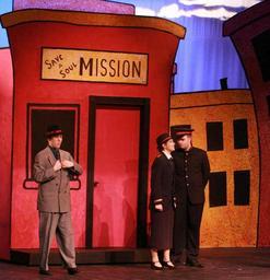 Keywords: SceneryWagon.jpg en A scenery wagon used in a high school production of Guys and Dolls The wagon's platform has a twelve foot tall framed building constructed on top of it with building exterior on one side and interior complete with built-in bookshelf A functioning full-size door enables actors to pass through the structure between its interior and exterior personas The wagon employs heavy-duty swivel casters so it can be rotated to face the interior or exterior toward the audience or rolled onstage or offstage Two toggle clamp type wagon brakes are mounted to the wagon one at each end so that the set piece can be quickly locked to or unlocked from the stage own Lambtron 2010-03-10 Set designs Guys and Dolls musical |