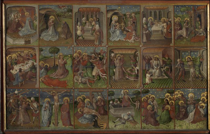 | Keywords: Scènes uit het leven van Christus Rijksmuseum SK-A-1491.jpeg accession number SK-A-1491 nl Achttien taferelen uit het leven van Christus bekend als de Roermondse passie Drie rijen van zes voorstellingen bovenste rij Verkondiging aan Maria de Geboorte de Besnijdenis de Aanbidding der Koningen de Presentatie in de tempel en de Intocht in Jeruzalem Middelste rij Laatste Avondmaal het gebed in Gethsemané het Verraad van Judas Christus voor Pilatus de Doornenkroning en de Geseling Onderste rij de Kruisdraging Chistus aan het kruis de Bewening de Opstanding de Hemelvaart van Christus en Pinksteren ; Maasland Roermond ca 1435 olieverf op doek op paneel drager Height cm 110 1 drager Width cm 173 3 drager Height cm 33 drager Width cm 27 5 drager+lijst Gewicht kg 33 2 exhibition history 1958-1958 Middeleeuwse Kunst der Noordelijke Nederlanden Amsterdam 1952-1952 Kunst der Maasvallei Rotterdam 1945-1945 Nederlandsche kunst van de XVde en XVIde eeuw Den Haag 1939-1939 Tentoonstelling bijbelsche kunst Amsterdam Institution Rijksmuseum canvas ; panel ; oil iconclass codes 73E5 73E425 73E12 73D 73D14 73B4 73B57 73B3 73B13 73A52 object history Acquisition 1889-03-01 object type Potential derivatives exist check http //commons wikimedia org/w/index php search Rijksmuseum+SK-A-1491 this search PD-US PD-old-100 Data and photography rights All data and all images made available through the API are either in the public domain or are subject to a CC0 license https //www rijksmuseum nl/en/api/terms-and-conditions-of-use cc-zero place of creation Maasland; Roermond ; Gelderland Inzoomer object op zaal 2013 Nederlands/English 'Passietafel niet terug naar Roermond' Limburgs dagblad 7 aug 2009 W Doesborgh 'Mr Houben laat zich niet als een schooljongen aan de kant schuiven' De Limburger 18 okt 2008 W Kloek 'Achttien taferelen uit het leven van Jezus Christus bekend als de Roermondse Passie' Rijksmuseum Kunstkrant 2003 p 24-25 Jaarverslag Rijksmuseum 1923 p 19 F Winkler 'Unbeachtete Holländische Maler des XV Jahrhunderts' Jahrbuch der Preussischen Kunstsammlungen 44 1923 p 139 afb 1 Jaarverslag Rijksmuseum 1899 p 10 http //www rijksmuseum nl/collectie/SK-A-1491 Scènes uit het leven van Christus Q17324215 Uploaded with GWToolset Scènes uit het leven van Christus Rijksmuseum SK-A-1491 http //www rijksmuseum nl/media/assets/SK-A-1491 Images uploaded by Fæ Images from the Rijksmuseum Early Netherlandish paintings in the Rijksmuseum Amsterdam |