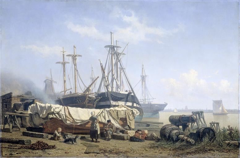 | Keywords: Schafttijd op een scheepstimmerwerf aan de Maas Rijksmuseum SK-A-1037.jpeg accession number SK-A-1037 Creator Johan Conrad Greive credit line nl Gezicht op een scheepstimmerwerf aan de Maas Een man eet zittend op een blok hout voor hem een vrouw met een kind Achter de personen een sloep afgedekt met zeilen In de werf liggen verschillende schepen die gerepareerd worden In de verte een molen drager Height cm 78 drager Width cm 119 exhibition history 2004-2007 Het Rijksmuseum aan de Merwede - A Dordrecht Institution Rijksmuseum Technique oil canvas object history Acquisition 1867 object type Potential derivatives exist check http //commons wikimedia org/w/index php search Rijksmuseum+SK-A-1037 this search PD-US PD-old Data and photography rights All data and all images made available through the API are either in the public domain or are subject to a CC0 license https //www rijksmuseum nl/en/api/terms-and-conditions-of-use cc-zero place of creation http //www rijksmuseum nl/collectie/SK-A-1037 Schafttijd op een scheepstimmerwerf aan de Maas Q17323706 Uploaded with GWToolset Schafttijd op een scheepstimmerwerf aan de Maas Rijksmuseum SK-A-1037 http //www rijksmuseum nl/media/assets/SK-A-1037 Images uploaded by Fæ Images from the Rijksmuseum Dutch 19th-century paintings in the Rijksmuseum Amsterdam Johan Conrad Greive |