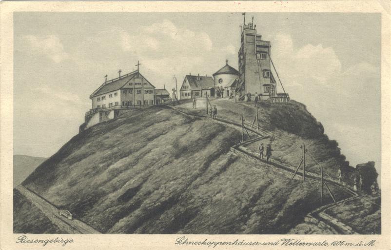 | Keywords: Scheekoppenhäuser und Wetterwarte um Jahrhundertwende.jpg Schneekoppenhäuser und Wetterwarte um die Jahrhundertwende 1900 Kupfertiefdruck Old postcard Franz Pietschmann Kunstverlag Görlitz from my personal collection unknown author PD-old History of Sněžka Chapel of Saint Lawrence Śnieżka Česká bouda Sněžka Deutsche Baude Schneekoppe Meteorological observatory at Śnieżka 1900-1989 | ||||