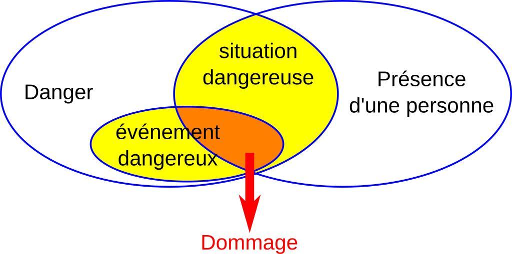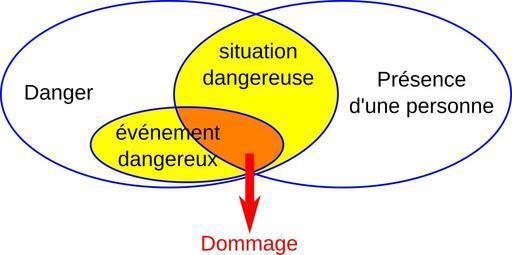 | Keywords: Schema apparition dommage.svg  en A damage may occurs when a person is in a dangerous situation i e is in presence of at least one danger and a dangerous event happens trigger fr Un dommage peut survenir lorsqu'une personne est en situation dangereuse c -à-d exposée à au moins un danger et que survient un événement dangereux déclencheur own Cdang 2010-11-03 inkscape Safety |