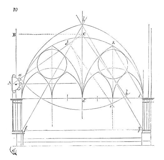 | Keywords: Schema.salle.synodale.Sens.2.png Si maintenant nous prenons un édifice ne possédant qu'un seul vaisseau voûté comme la salle synodale de Sens bâtie en même temps que le chœur de Beauvais nous verrons que l'architecte a procédé d'après une méthode semblable à celle que nous venons de décrire Un quart de travée de cette salle étant figuré en ABC fig 10 la voûte a d'abord été tracée c'est-à-dire que sur la projection horizontale AC de l'arc ogive on a tracé le demi-cercle <i>ab</i> qui est le rabattement de la moitié de cet arc; prenant sur le demi-diamètre <i>a</i>C une longueur <i>ad</i> égale à la moitié de la base de l'arc-doubleau et élevant une perpendiculaire de sur la ligne <i>a</i>C le point de rencontre <i>e</i> a donné la clef de l'arc-doubleau et <i>ae</i> sa courbe; donc <i>de</i> est la flèche de cet arc-doubleau Viollet-le-Duc Drawings by Eugène Viollet-le-Duc |