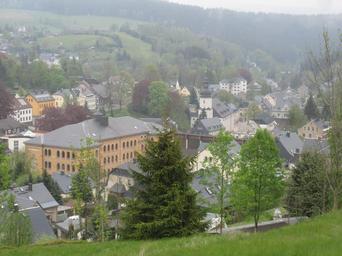 Keywords: Schönheide im Erzgebirge Dorfzentrum vom Knock.jpg Schönheide im Erzgebirge Als žstadtähnlich gebaut beschrieben schon zu Beginn des 19 Jahrhunderts die Verfasser von Regionalgeographien das große einwohnerstarke Dorf mit um die 5 000 Einwohner schon um 1800 Hier der Blick vom Knock nach Ost-Nord-Ost Im Taleinschnitt des in den 1920er/1930er Jahren verrohrten Dorfbachs der von Westen nach Osten fließt Links der gelbe Backsteinbau ist die 1898 eröffnete Schule im Zentrum Weiter abwärts steht die Martin-Luther-Kirche Das Fachwerkhaus davor ist das Bürsten- und Heimatmuseum Rechts das grün gestrichene Gebäude mit dem grauen Türmchen ist das Rathaus von 1882 Oberhalb der geschlossenen Bebauung ist im linken Bereich der Webersberg zu sehen own Klaaschwotzer 2014-05-03 Schönheide Cc-zero |