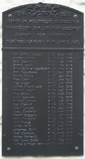 | Keywords: Schönheide im Erzgebirge Gedenktafel¬ Turner Erster Weltkrieg 2.jpg Schönheide im Erzgebirge - In den 2000er Jahren wurde diese gusseiserene Gedächtnistafel an der Außenwand des Bürsten- und Heimatmuseums angebracht Sie erinnert an die im Ersten Weltkrieg gestorbenen Turner aus Schönheiderhammer Die Tafel hat diesen Wortlaut 1914 “ 1918 Seinen im Weltkrieg gefallenen Turnbrüdern zum ehrenden Gedenken gewidmet vom Turnverein Schönheiderhammer im Jahre 1921 ANGER Max + 30 07 1915; BAUMANN Arno + 12 08 1916; BAUMANN Kurt + 14 09 1918; BAUMANN Paul + 27 09 1914; BERNBRICH Hans + 19 10 1917; BOCK Johannes + 02 09 1918; BRÄUER Wilhelm + 13 10 1916; EINER Max + 15 06 1915; FRIESS Walter + 06 06 1915; GOTTWALD Walter + 09 10 1918; GROPP Max + 25 09 1915; LENK Arthur + 30 10 1914; LENK Arthur Rudolf + 17 08 1915; LORENZ Arthur + 08 09 1914; LORENZ Emil + 30 01 1917; PREISS; Paul + 14 08 1918; QUERFURTH Horst Edler von + 24 11 1914; ROSENHAUER Otto + 12 04 1915; SEIDEL Paul Alfred + 20 08 1914; SEIDEL Paul Louis + 05 11 1918; SELBMANN Walter + 20 09 1917 vermisst; SICKERT Paul + 14 10 1916; WOLF Walter + 15 08 1918 Die Namensliste auf der Tafel ist in kalendarischer Reihenfolge und die Nachnamen sind nicht in Großbuchstaben gestaltet der Nachname steht nach den Vornamen Die Tafel ist aufgenommen in das Denkmalprojekt das Denkmale und ihre Inhalte beschreibt die an Tote der beiden Weltkrieg erinnern http //www denkmalprojekt org/2011/schoenheide_wk1_sachs html abgerufen am 2 Februar 2014 own Klaaschwotzer 2009-11-18 Schönheide Schönheiderhammer World War I sportsmen memorial of Schönheiderhammer Cc-zero |