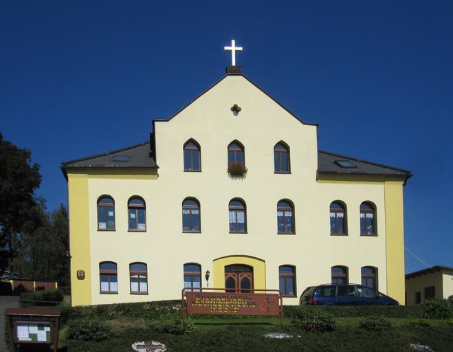 Keywords: Schönheide im Erzgebirge Methodistenkirche von 1906.jpg Schönheide - Ore Mountains Methodist Church of 1906 Schönheide im Erzgebirge Methodisten-Kirche auf der Oberen Straße nicht weit vom Rathaus entfernt aus dem 1906 Ernst Flath Aus dem Erzgebirge Geschichte von Schönheide Schönheiderhammer und Neuheide Komissionsverlag von Armin Stopps Buchhandlung Schönheide o J 1909 schreibt Im Besitz einer schönen Kapelle ist die Methodistengemeinde Diese gehört zu den 'Gesellschaften des Zwickauer Bezirks der Bischöflichen Methodistenkirche im Königreiche Sachen' eingetr Verein und besteht nunmehr 10 Jahre lang Ihre Gottesdienste hielt die Gemeinde bis zum Sommer 1906 in einem gepachteten Fabriksaale ab Die sodann geschaffene Kapelle in erhöhter schöner Lage des untern Ortstheiles befindlich wurde Sonntag den 9 September 1906 feierlich eingeweiht Das Gebäude war ehemals die Weberei der hiesigen Wollwarendruckfabrik und ging durch kauf in die Hände der Methodistengemeinde über Baumeister Schmidt hier hat es verstanden dieses alte Gebäude vollständig umzuwandeln Das Ganze macht einen freundlichen Eindruck enthält einen Saal Wohnräume Musikzimmer und ist in gotischem Stil gehalten Am Einweihungstage waren mehrere Prediger anwesend Die Anzahl der Gemeindeglieder soll zur Zeit der kapellenweihe gegen 500 betragen haben und sich seitdem bis auf die Gegenwart um einige Hundert vermehrt haben den Kirchennachrichten gemäß sind Erbauungsstunden Predigtgottesdienste Schwesternvereins- und Jugendbundeszusammenkünfte Evangelisations- und Blaukreuzversammlungen und dgl die hauptsächlichen Veranstaltungen der Gemeinde an Sonn- und Feiertagen vor- und nachmittags an Werktagen abends Schönheide - Monti Metalliferi Chiesa metodistica del' anno 1906 own Klaaschwotzer 2014-09-17 Methodist Church in Schönheide Cc-zero |