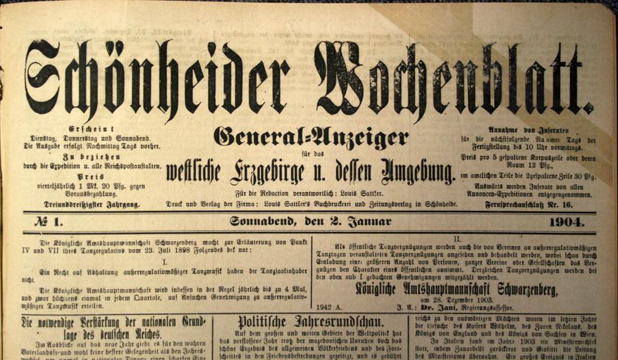 Keywords: Schönheide im Erzgebirge Schönheider Wochenblatt 1 von 1904.jpg Schönheide im Erzgebirge “ Seit 1876 erschien das Schönheider Wochenblatt Vom Ende des 19 Jahrhunderts bis zum Einstellen des Erscheinens im Zweiten Weltkrieg im Frühjahr 1942 kam das Blatt drei Mal in Woche heraus dienstags donnerstags und sonnabends Wie oft in der Woche die Zeitung in der Zeit zwischen 1876 und um die Wende zu 1900 herauskam ist wahrscheinlich nicht bekannt Erhalten haben sich die Jahrgänge seit Ende des 19 Jahrhunderts Es erschien in der genannten Zeit im sog Berliner Format war also gut DIN A 3 groß Das Schönheider Wochenblatt hatte nach dem Ende des Zweiten Weltkrieges im Mai 1945 eine kurze Renaissance bis zur à bernahme des von Kriegsende am 8 Mai 1945 bis Ende Juni 1945 von den Alliierten nicht besetzten Gebietes durch die Rote Armee Der sowjetische Militäradministration verbot das weitere Erscheinen dieses Blattes wie der anderen Zeitungen die nicht durch die Militärverwaltung und die von ihr eingesetzten Behörden kontrolliert wurden Erst Ende 1989 ergriff Eberhard Mädler die Initiative und schuf das Schönheider Wochenblatt neu 2014 erscheint es im 25 Jahrgang der neuen Zählung seit 1989 Foto Dies ist der obere Teil des Titelblatts der ersten Ausgabe des Jahres 1904 own Klaaschwotzer 1904 Historical documents of Schönheide Historical documents of Schönheiderhammer Schönheider Wochenblatt Cc-zero |