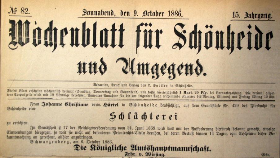 Keywords: Schönheide im Erzgebirge Schönheider Wochenblatt 1.jpg Schönheide im Erzgebirge Amtliche Bekanntmachung von 1886 des Vorhabens eine Schlächterei zu eröffnen in der Dorfmitte im Haus Hauptstraße 257 “ heute 88 Betreiberin war Frau Härtel später wurde für die Fleischerei die Bezeichnung Härtel-Ev verwendet auch in der Form Ef Auch in eigenen Anzeigen dieser Fleischerei verwendeten die Inhaber ähnliche Bezeichnungen Dies wurde von den Dorfbewohnern allgemein für eine Abkürzung gehalten Am 18 August 1910 wird in einer Anzeige im Wochenblatt diese Formulierung verwendet Albin Härtel Ev Newspaper Klaaschwotzer 1886 Schönheider Wochenblatt Historical documents of Schönheide Cc-zero |