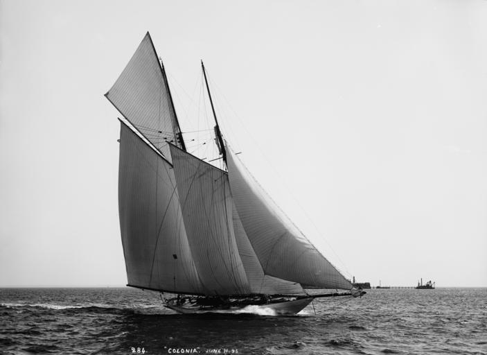 | Keywords: Schooner Colonia-09.jpg Larchmont Yacht Club Commodore Clarence Ashley Postley's schooner Colonia designed and built as a sloop in 1893 by Herreshoff to be a candidate in the 1893 America's Cup rerigged as a schooner under the supervision of Archibald Cary Smith who fitted her with a centerboard She is pictured here racing in the New York Yacht Club's annual regatta which she lost in a close match with the Emerald http //query nytimes com/mem/archive-free/pdf res 9C00E6DB1E3DE433A25751C2A9649D94649ED7CF New York Times - Colonia as a schooner http //query nytimes com/mem/archive-free/pdf res F10D17F93A5C107389DDAB0994DE405B8685F0D3 New York Times - Emerald's fine race LOC-image det 4a21580 Creator John S Johnston 1896-06-11 PD-Detroit Colonia ship 1893 as schooner Boats under sail Photographs by John S Johnston Black and white photographs |