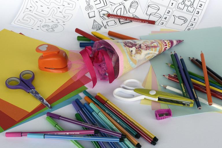Keywords: schultüte zuckertüte back to school training school first class school launch colorful first-graders surprise education candy writing accessories felt tip pens colored pencils crayons pens draw color colour pencils paint chalk exercises scissors paper colorful paper tinker cut pencil stationery pointed coupon