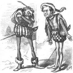 | Keywords: Schurz and Trumbull as Richard III and Gloucester.png  en U S Senators Schurz and Trumbull as Gloucester and Buckingham play Act III Scene VII from Shakespeare's play Richard III Harper's Weekly May 4 1872 p 345 Creator Thomas Nast 1872-05-04 Caption <table><tr valign top > <td> C S How now how now what say the citizens <br> Trumbull The citizens are mum say not a word <br> I laid open all your victories <br> Your discipline in war wisdom in peace <br> Your bounty virtue fair humility <br> And when my oratory grew to an end <br> I bade them that did love their country's good <br> Cry Hurra for Schurz<br> They spake not a word; </td> <td>    <td> But like dumb statues or breathless stones <br> Star'd on each other and look'd deadly pale <br> When I had done some followers of mine own <br> At lower end o' the hall hurl'd up their caps <br> And some ten voices cried Hurra for Schurz <br> And thus I took the vantage of those few <br> Thanks gentle citizens and friends quoth I;<br> This general applause and cheerful shout <br> Argues your wisdom and your love to Carl <br> And even here brake off and came away <br> Richard III Act III Scene VII </td> </tr></table> PD-old-100 Caricatures of Carl Schurz Thomas Nast Lyman Trumbull 1872 cartoons 1870s political cartoons of the United States |